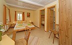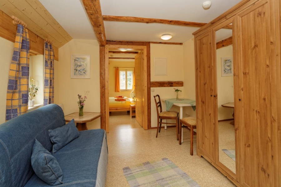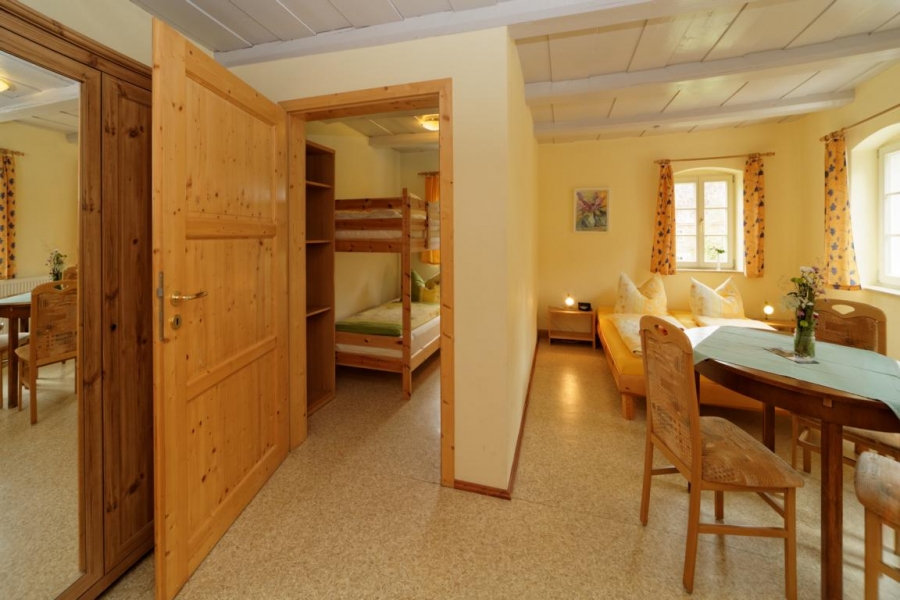 Wohneinheit 1 ist ausgestattet mit einem Doppelbett sowie einem Etagenbett im abgetrennten Schlafraum.
