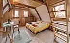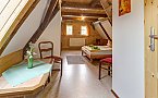 Das Dachgeschoss verfügt über zwei Wohneinheiten mit jeweils zwei Schlafebenen: Im Spitzboden ist ein zweites Doppelbett eingebaut, erreichbar über eine kleine Treppe.