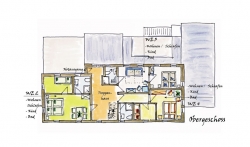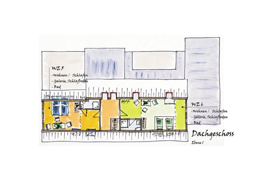 Im Obergeschoss befinden sich drei Wohneinheiten: Wohneinheit 2 mit Ehebett und Etagenbett in getrennten Zimmern, Wohneinheit 3 mit Ehebett und Schlafcouch in getrennten Zimmern sowie Wohneinheit 4 mit Ehebett und Etagenbett (nur 1,90 m lang) – hier kein Durchgangszimmer.