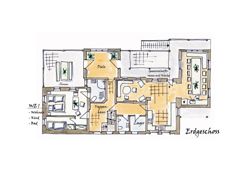 Im Erdgeschoss befindet sich die Wohneinheit 1 – hier darf sich auch ein Haustier aufhalten – sowie der Küchen- und Aufenthaltsbereich. Die Küche ist komfortabel und ausreichend für alle Gäste des Hauses ausgerüstet: Geschirr, Besteck, sowie u. a. Spülmaschine, zwei Kaffeemaschinen, Mikrowelle, Herd, Backofen, zwei Kühlschränke, Toaster, Wasserkocher.