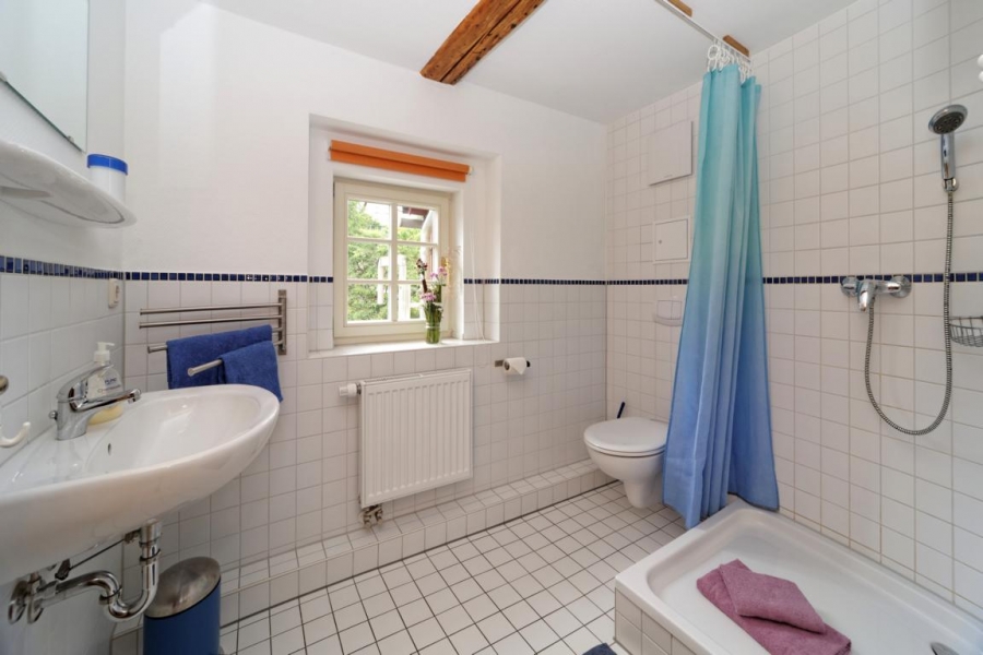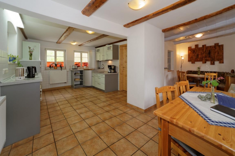 Im Erdgeschoss befindet sich die Wohneinheit 1 – hier darf sich auch ein Haustier aufhalten – sowie der Küchen- und Aufenthaltsbereich. Die Küche ist komfortabel und ausreichend für alle Gäste des Hauses ausgerüstet: Geschirr, Besteck, sowie u. a. Spülmaschine, zwei Kaffeemaschinen, Mikrowelle, Herd, Backofen, zwei Kühlschränke, Toaster, Wasserkocher.