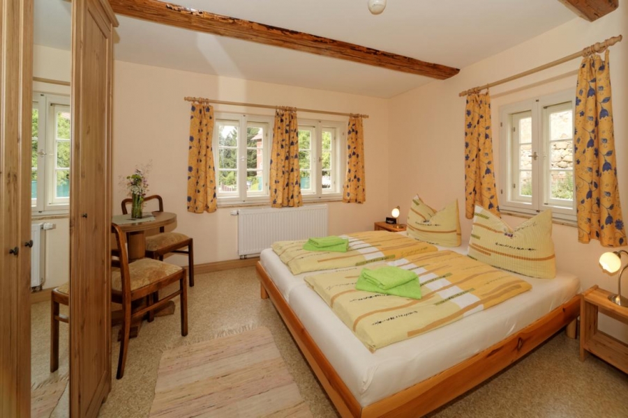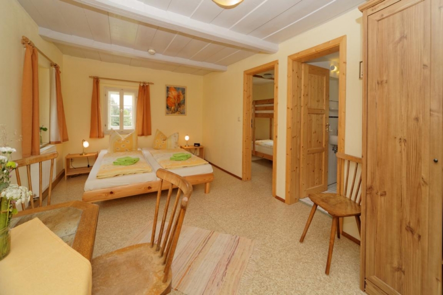 Wohneinheit 1 ist ausgestattet mit einem Doppelbett sowie einem Etagenbett im abgetrennten Schlafraum.