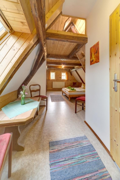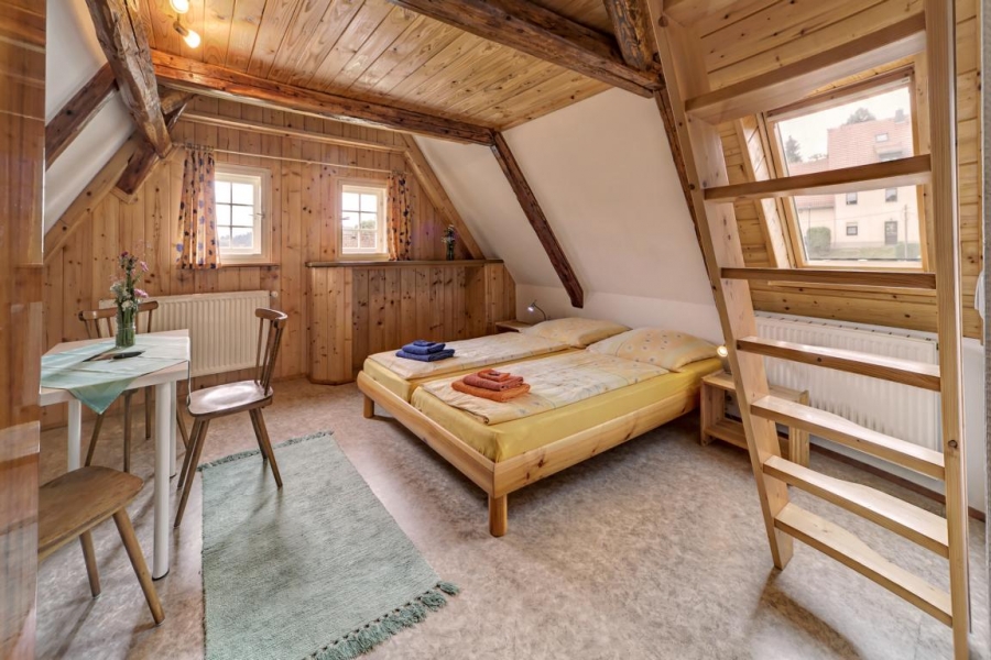 Das Dachgeschoss verfügt über zwei Wohneinheiten mit jeweils zwei Schlafebenen: Im Spitzboden ist ein zweites Doppelbett eingebaut, erreichbar über eine kleine Treppe.